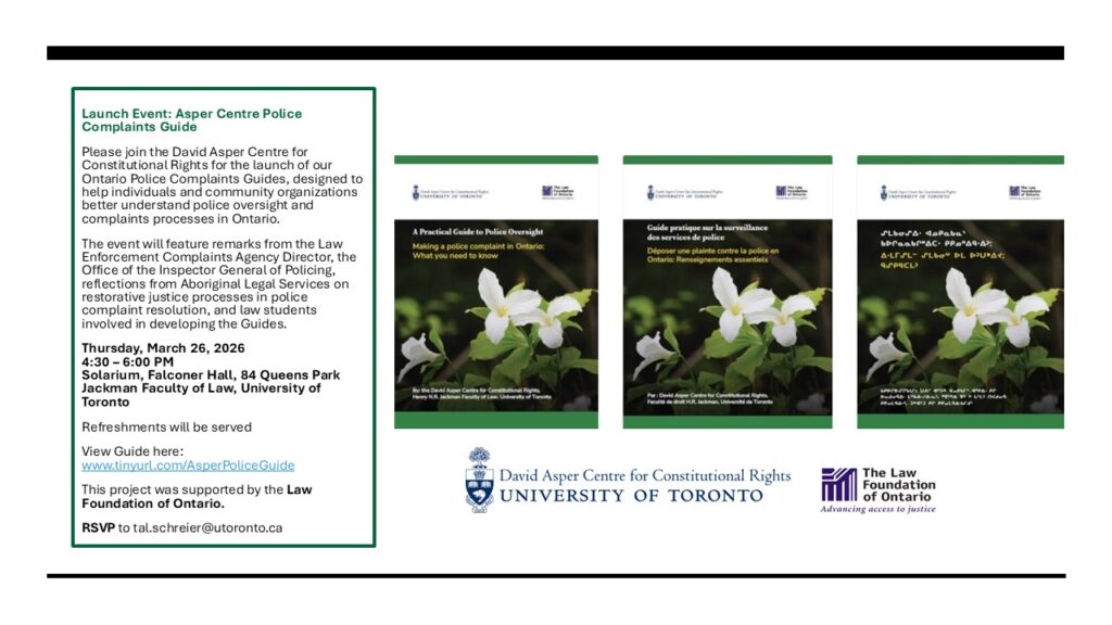 The Asper Centre has developed a Police Complaints Guide for Ontario — a practical resource designed to help community members understand and navigate Ontario’s police complaints and oversight systems. To support accessibility across communities, the guide is available as a downloadable PDF in English, French, and Oji-Cree (Anishininiimowin / ᐊᓂᐦᔑᓂᓃᒧᐏᐣ).